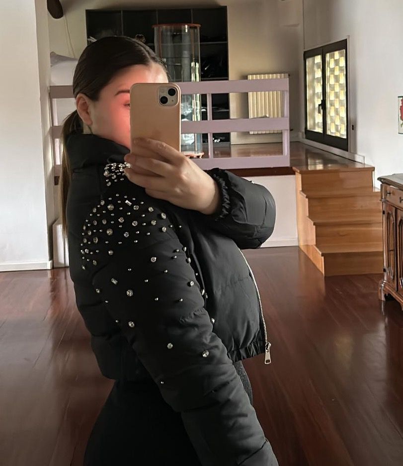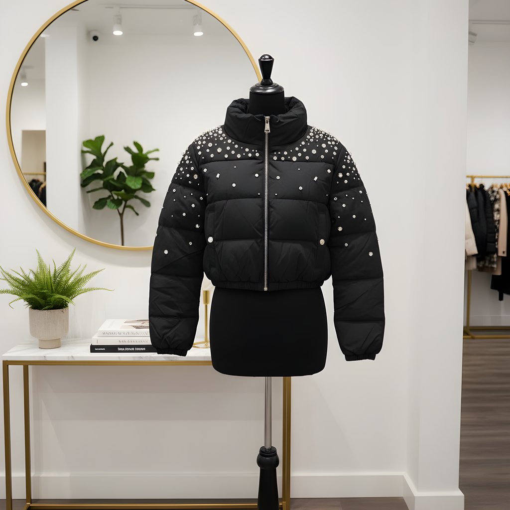 Piumino corto con cascata di strass di varie dimensioni