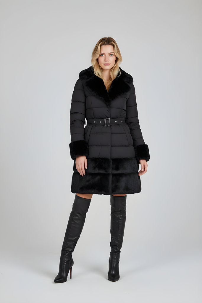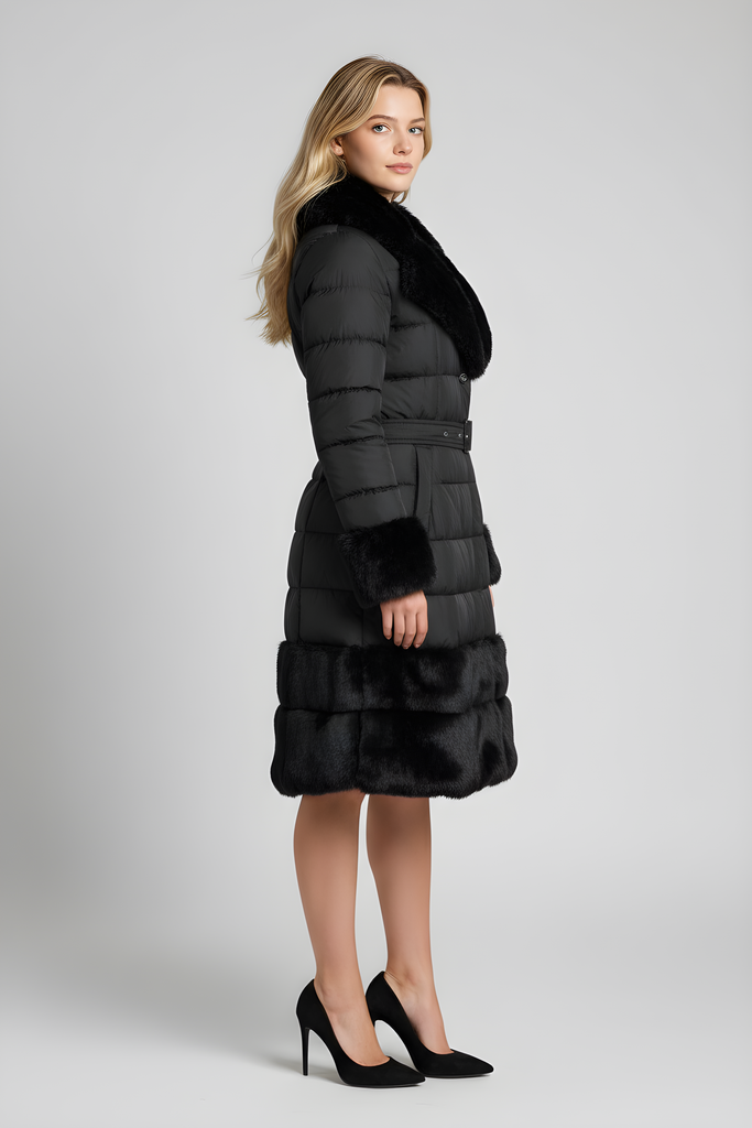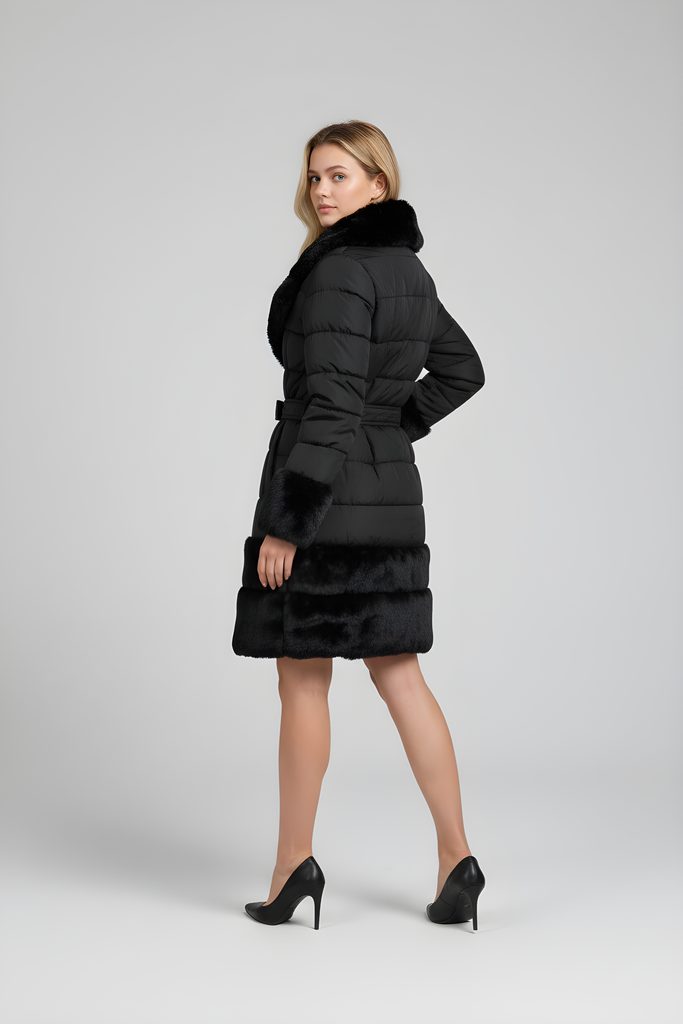 Piumino con inserti in pelliccia e cintura
