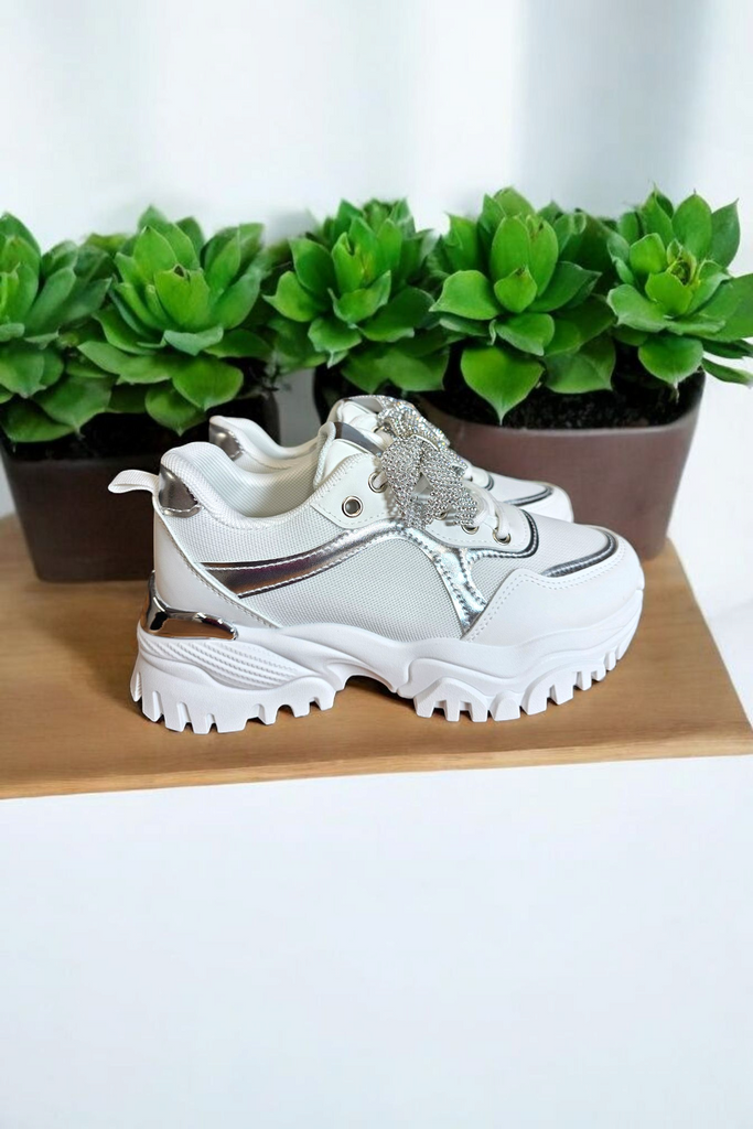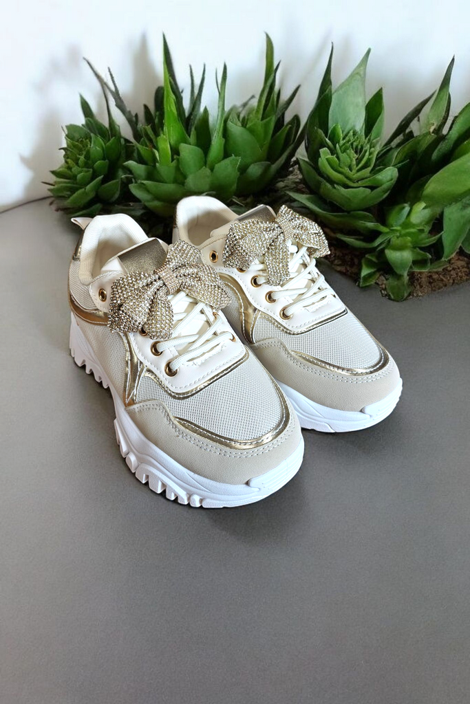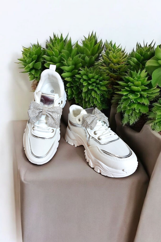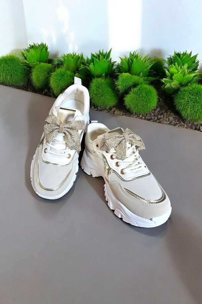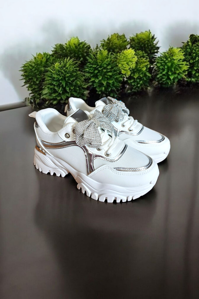 Sneackers in ecopelle e tessuto con lacci suola rialzata 4cm e fiocco strass removibile