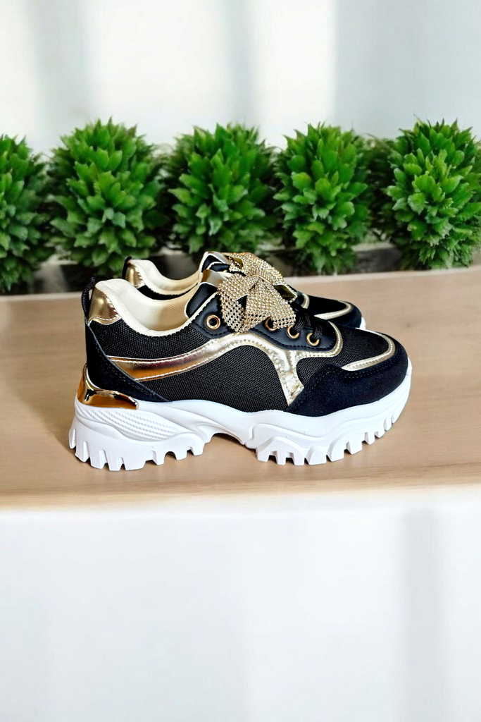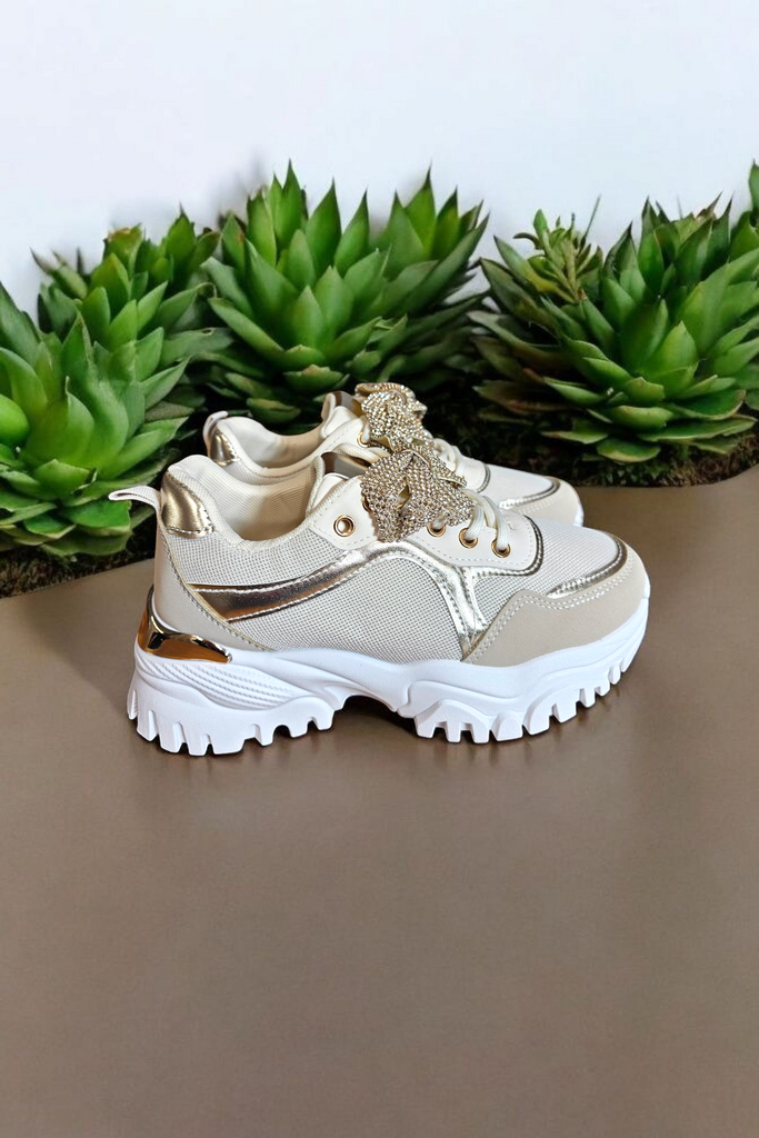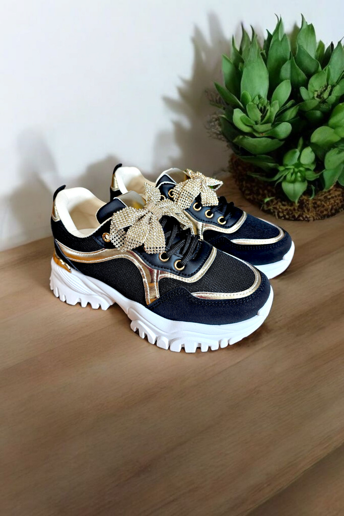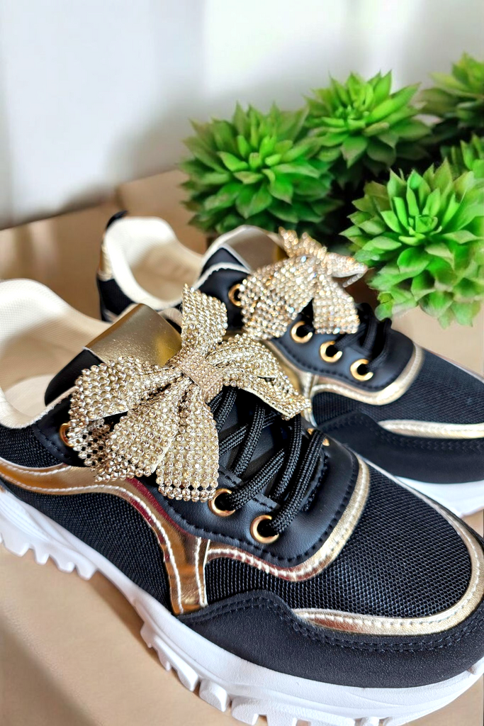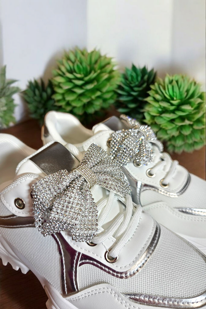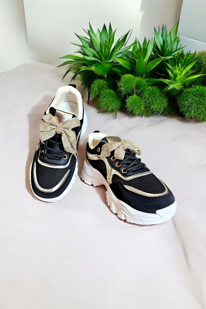 Sneackers in ecopelle e tessuto con lacci suola rialzata 4cm e fiocco strass removibile