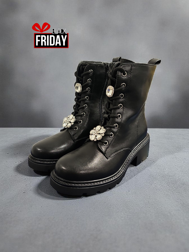 Stivaletto in ecopelli con lacci e zip interna suola.in gomma e dettagli gioiello removibili
