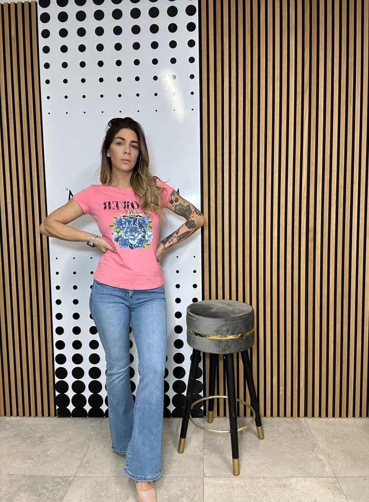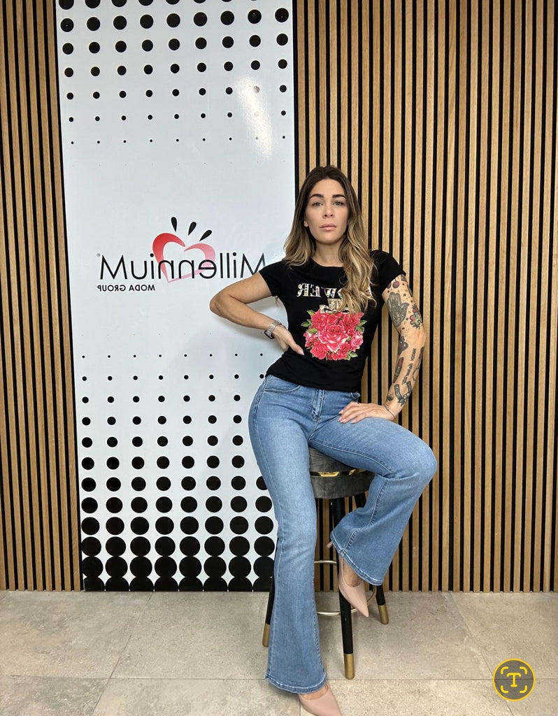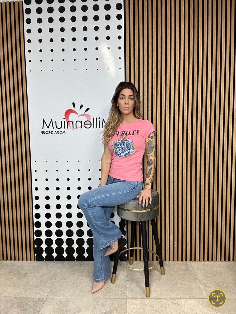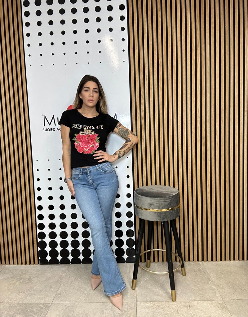 T shirt cotone elasticizzato con stampa e applicazione strass