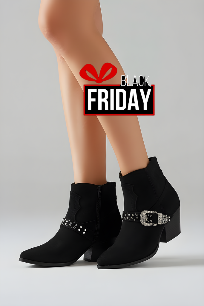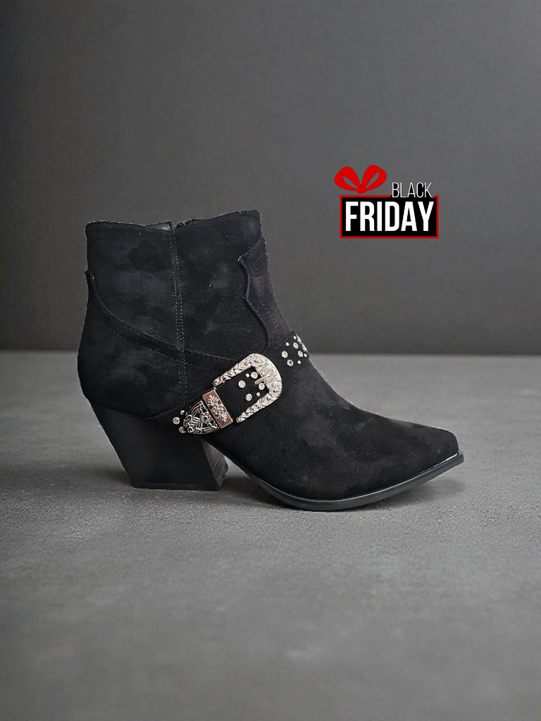 Stivaletto modello texano basso in ecocamoscio con fibia e dettagli strass.